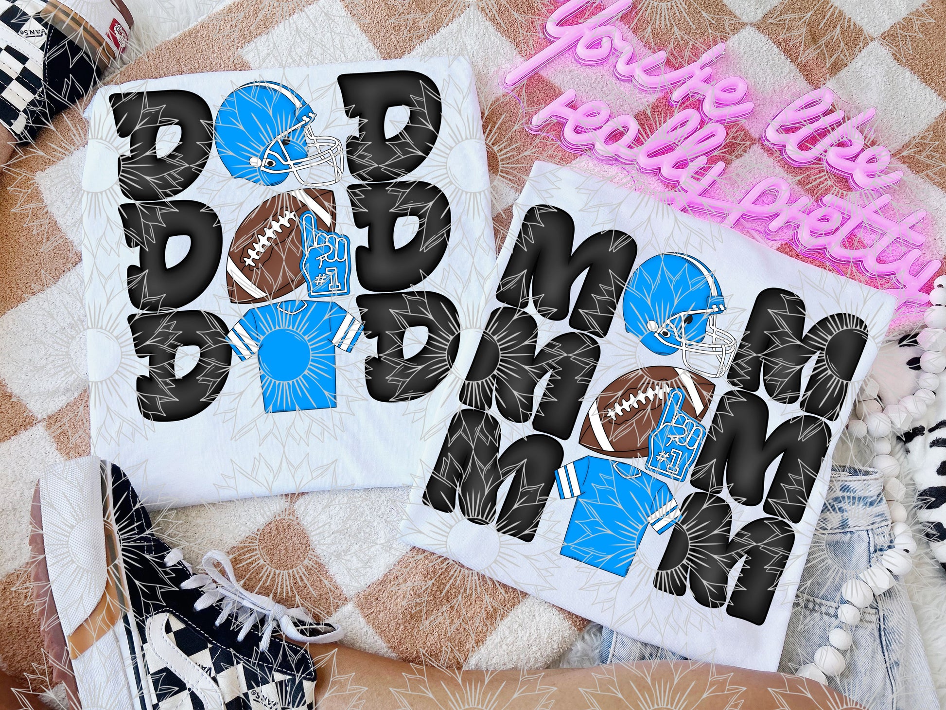 Stacked Football Mom and Dad Light Blue